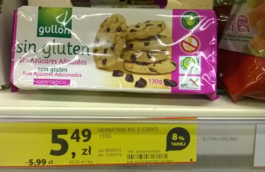 W dużych marketach znalazłam m. in. mało znane u nas bezglutenowe ciasteczka firmy Gullon. Mają nienajgorszy skład i cenę również przystępną (jak na bezglutenowe słodycze).